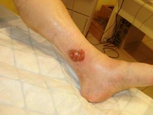 A jobb lábon 2 cm átmérőjű fekélyes seb