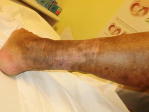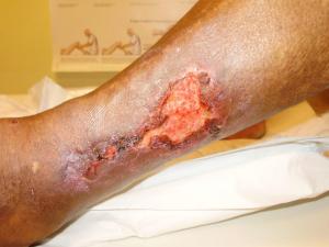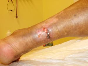Keringési rendellenességben szenvedő 67 éves férfi bal lábszárán lévő 5x3 cm fekélyes seb a kezelések előtt